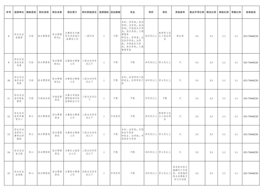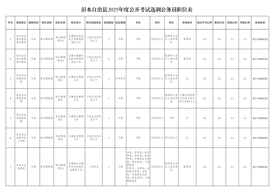 本次共选调公务员17名,具体职位及资格条件见《彭水自治县2025年度公开考试选调公务员职位表》(附件1,以下简称《职位表》)。